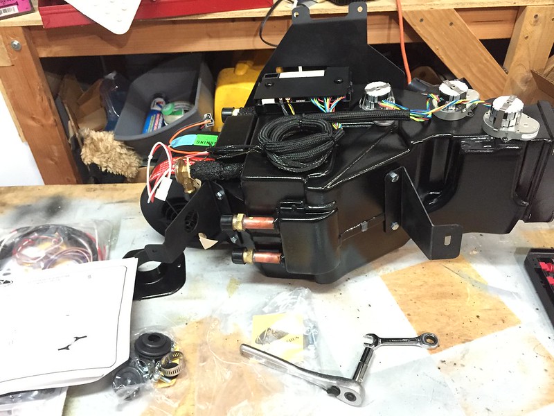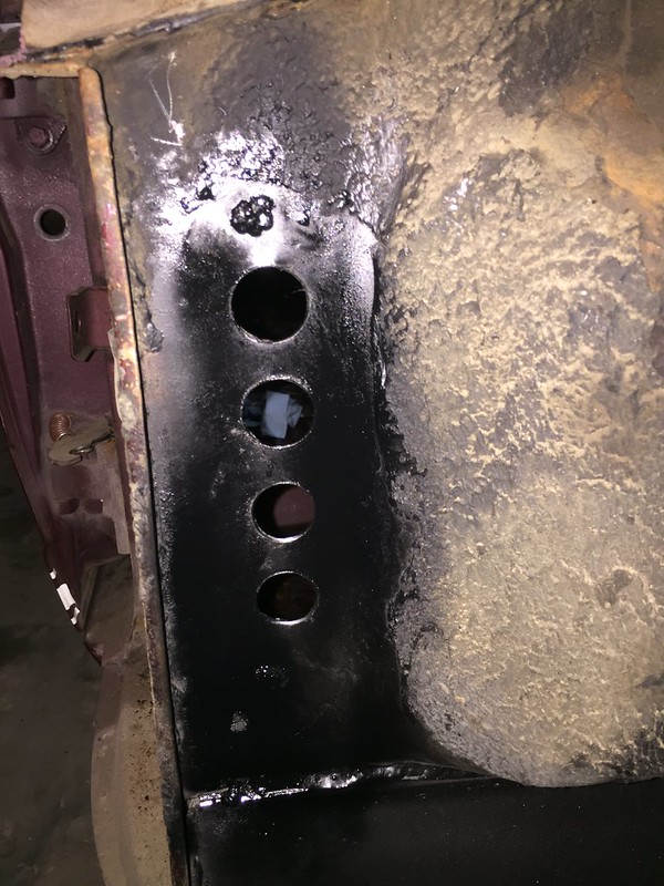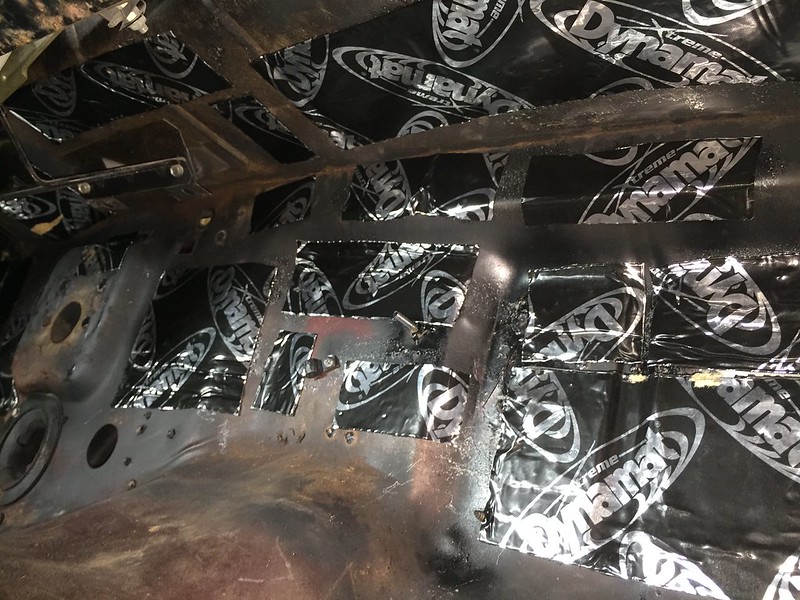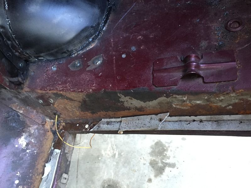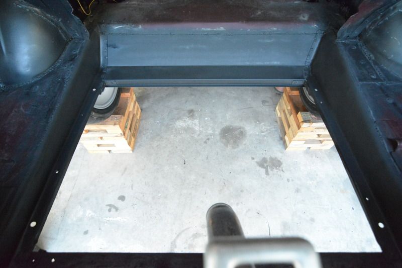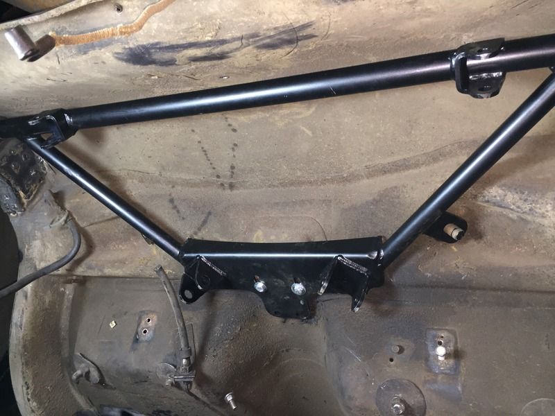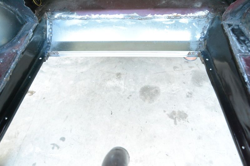 Ridetech installation. Had to narrow the 4-link bracket to fit between the replacement DSE frame rails