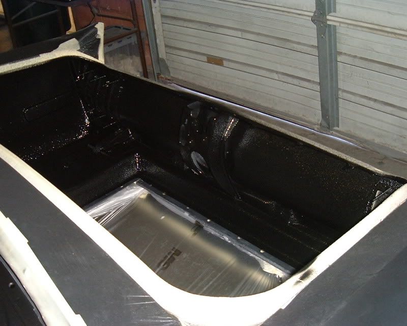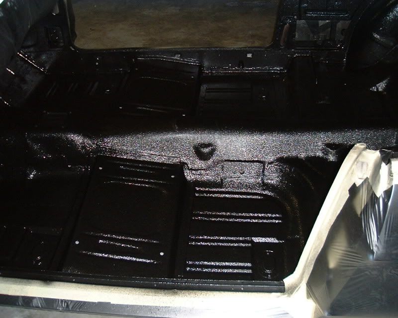 Brian taped off the complete car than sprayed a coat of epoxy than SPI bedliner on the trunk floor and interior floor.