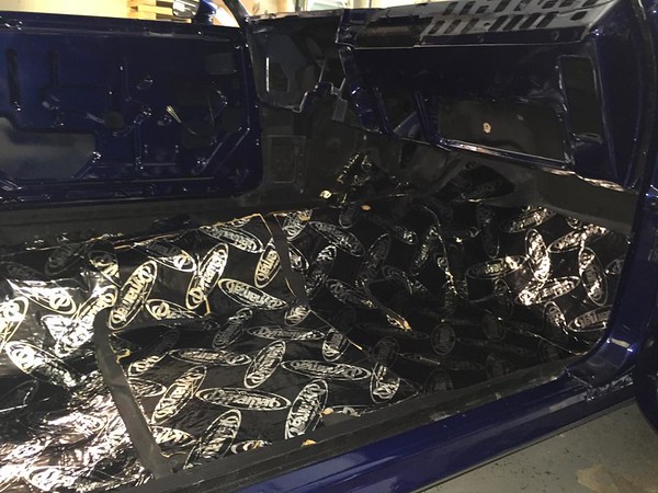 Soon as I got it in the garage, started on the Dynomat. This pic was the mock-up. That pre-cut kit is awesome.