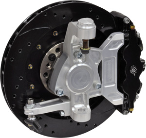 The new gStreet billet aluminum spindle is available with 14” and 15” rotors!  Think about that for a second.  The 15” rotor might have a larger diameter than your car’s factory wheel.  For size comparison we grabbed a large pizza box and tried to fit the rotor inside.  No dice -the rotor is bigger.  The new gStreet billet upright not only has a larger unit-type bearing and a trick bump-steer adjuster; it has massive brakes!