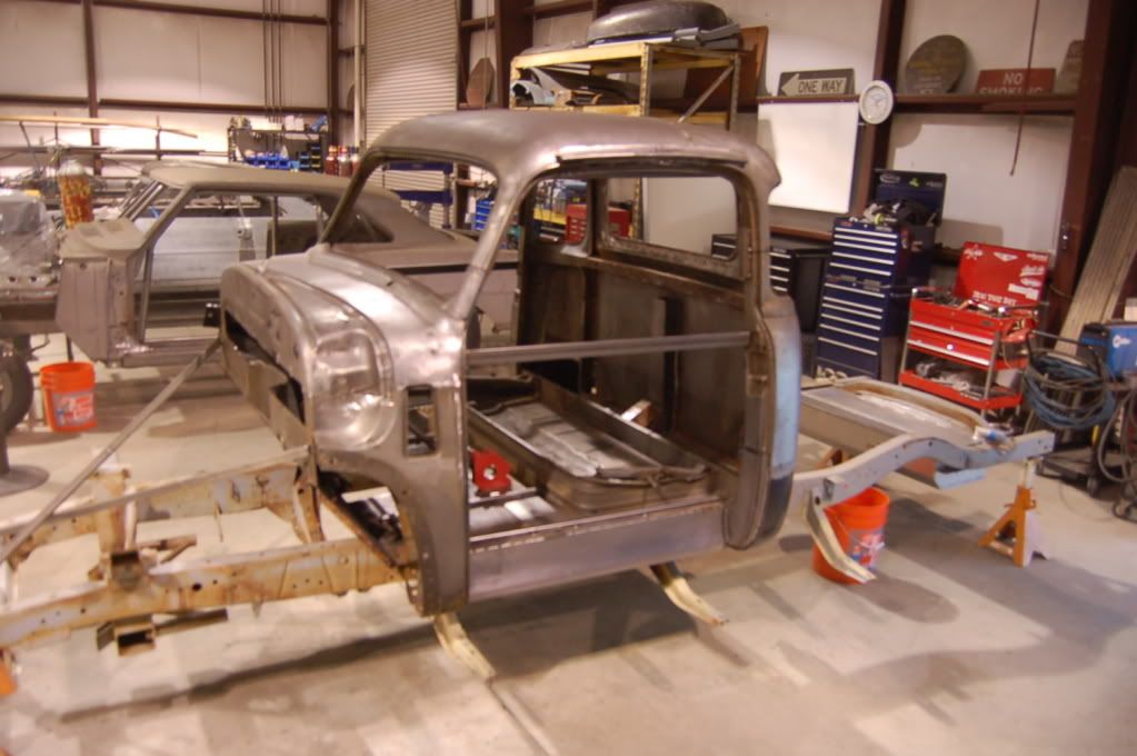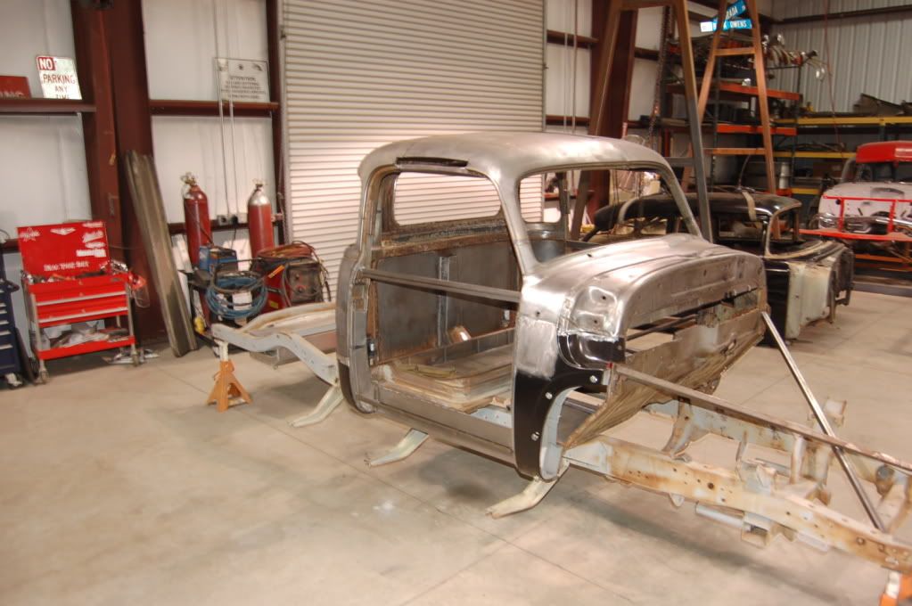 So here we go. A local Customer that I met a small local show just about a year ago that owns a large engineering firm down the street from me started talking to us about building a 1947-54 chevy truck. I informed him that one of my magazine editor buddies had an older chassis with all the suspension and such set up was for sale for a really good deal. Well after purchasing the chassis, he went to a local truck auction that was selling 47-54 chevy truck stuff. This is the really ironic part, He bought 2 cabs, 2 hoods, 6 doors and 1 set of inner fenders. He had some bed sides and a few other NOS or really solid truck parts in storage already. So this is what we started with.