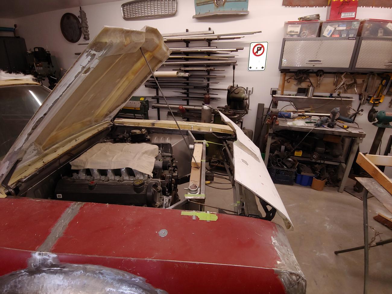 More progress... good times. Started building a fiberglass hood for the Torino way back. Had a plan of fiberglass hood and making it a cowl hood for space for the intake I was going to build. When I had the car on the ground to get an idea where I was at I laid the hood and cowl on it to check it out.