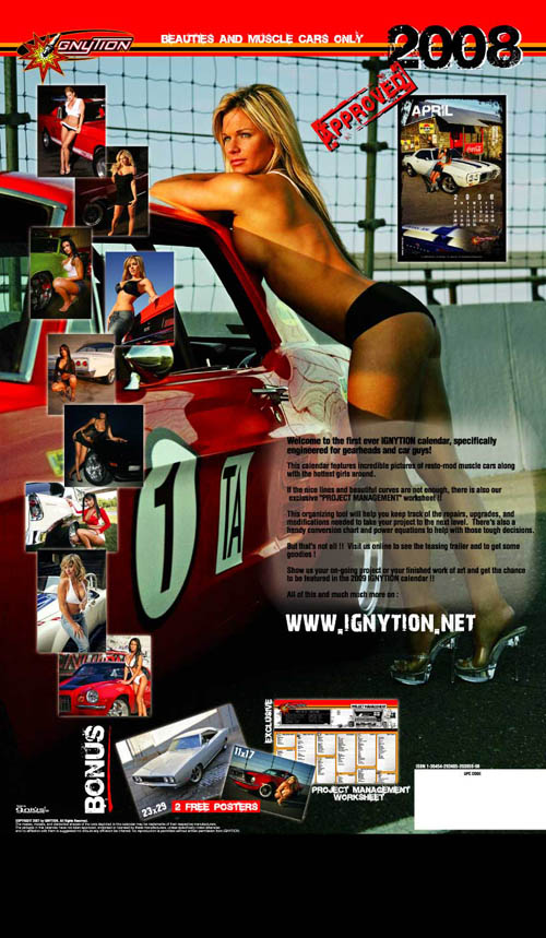 This calendar features incredible pictures of resto-mod muscle cars along with the hottest girls around. If the nices lines and beautiful curves are not enough, there is also our exclusive PROJECT MANAGEMENT worksheet. This organizing tool will help you keep track of the repairs, upgrades, and modifications needed to take your project to the next level. There’s also a handy conversion chart and power equations to help with those tough desisions. But that’s not all, visit us online to see the teasing trailer and to get your free desktop wall paper.
