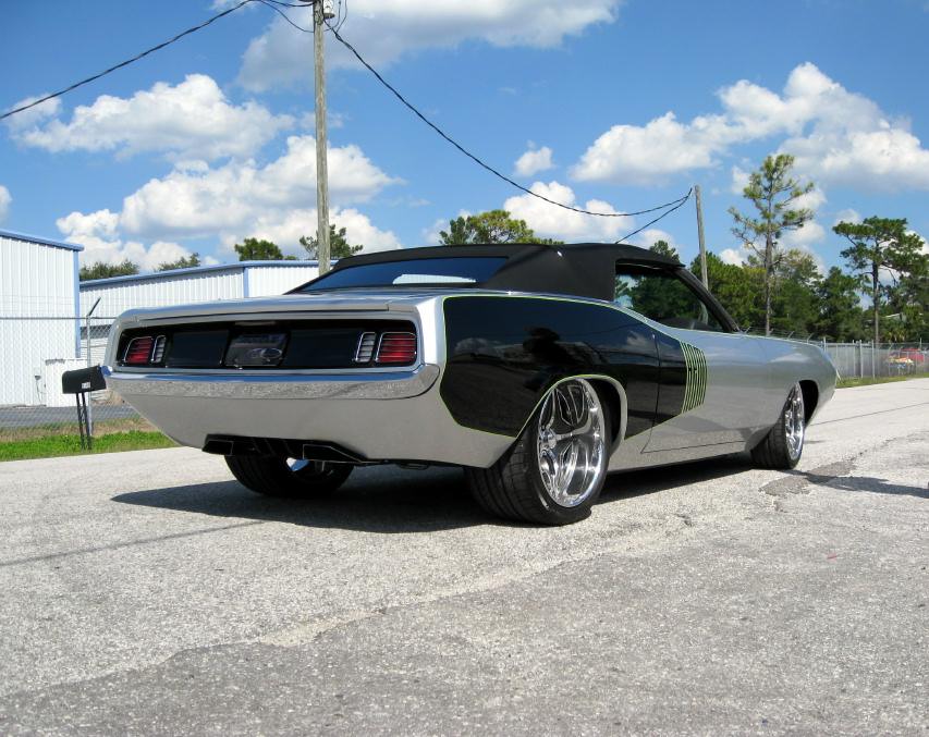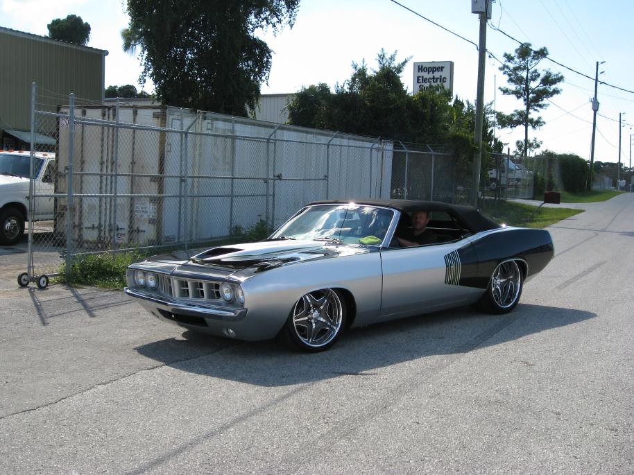 It is Mike from Time Machines. I wanted to post pictures of our new cuda that we debuted at the Playboy Mansion and SEMA. This is one in our new line of cars called Modern Muscle. The line has three cars; 70-71 cuda, 69 camaro, and 69-70 Mustang fastback. The camaro also was at SEMA. I will post pictures later on that car. I am not real good with the computer and posting pictures but I will do my best to get you pictures. I hope these pictures are ok. Jason Rushforth helped me with the design of the line as well as our wheels. They are different, I was trying to blend a classic Halibrand wheel with a magnum 500 style wheel and this is what we came up with.