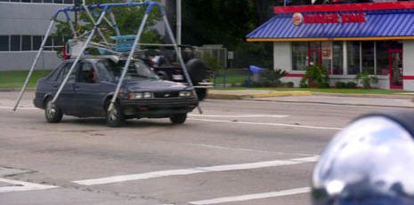 Poor kid didnt know what hit him! One minute he is swinging in the back yard, next minute some car runs through the swing set and hes cruising down the main street.