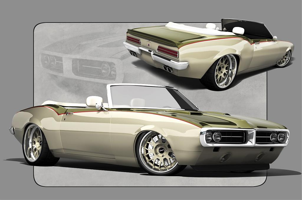 Ok The day has finally come. I have been lurking here for a while now. Now its time to post my project. I just received my Rendering from Kris Horton aside from the change on the interior color it is finished. The plans for this car include, an LS3 with a stick. Art morrison sub frame, DSE mini tubs, Moser rear, Air ride, 13" wilwood brakes, Forgeline wheels ect. We are also going with a few body mods. Reverse 69 camaro tail lights, only because marquez design doesn't have the firebird lights! 69 camaro front valance, 67 camaro quarters (one of my quarters was missing when i bought the car, and we couldn't find firebird quarters)