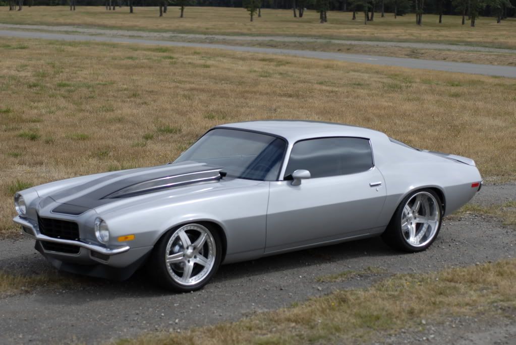 Here is my baby, my first car, 1973 Camaro. I got it at age 15 and have been beating on it for a little over 12 years. A year ago I decided it was time to learn something new and build a pro-touring car. After a few phone calls I was sure that Mark Savitske (SC&C) was the suspension guy I would trust. I quickly ordered a Alston G-bar and adjustable coilovers in back. For the front I chose a “one of a kind path.” That would be ATS spindles, SPC adjustable control arms, and Alston double adjustable (Varishock) coilovers. ATS does not make a spindle for second generation Camaros, but Savitske fixed me up with some steering arms (1968-1972 Chevelle). He is pretty handy on suspension geometry. At this point I figured that I better go for it. I mini-tubbed the car and picked up about 2 inches. That is the most I could go and use the factory panels, seats, and seat belts. Besides, I have to leave some room for the kids. Then I build some subframe connectors and graft them into the body to make them as strong as possible. As I looked up front I knew there was more to do. I racked the subframe square and welded and smoothed the factory seams. Then I build some strut bars and ran them back to the firewall. The car still sat too high, so I cut out the shock mounting pockets and moved them up 1 ¾” and was able to keep my full length coil-overs. Now the car sat right, but out back that dang stock gas tank hung too low in it‘s factory location. To fix that I fabricated a new flat trunk pan and sucked that tank up so you can not see it anymore. I don’t have a spare tire anyway.