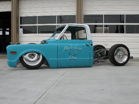 This frame will easily lay out on 22's all the way around and probably even 24's with a small tire. The centerlines on it are 20's but have a huge tire (29.8 inches tall according to tire specs). The photo of the truck has a machined down piece of rubber instead of a stock mount to lay on the pinch weld. All you would have to do is modify the bed mounts to make the whole truck sit like that.