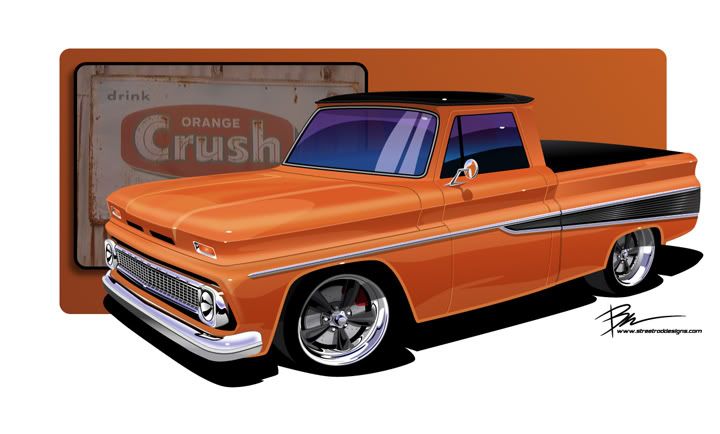I did this one for our class project. I've gone back to school for an associates in collision repair with a street rod emphasis, started this past August. My goal when I'm done is to start building what I draw. In my 1st year "resurfacing" class we invite members of the public to bring in projects for the students to work on. This year we took in an old 60's Chevy farm truck. I don't think there was one inch of sheet metal that wasn't banged up or rusted so it's been a project the whole class has been able to get involved on. The owner wants us to paint it "Orange Crush Orange" so I threw this rendering together with a little bit of my spice added to display with the truck for some publicity for the school. Our professor will be doing the air brushing for the mix of original truck and 57 Belair trim. Enjoy...