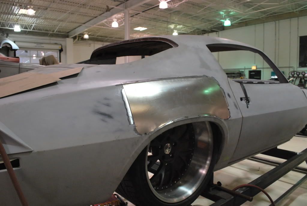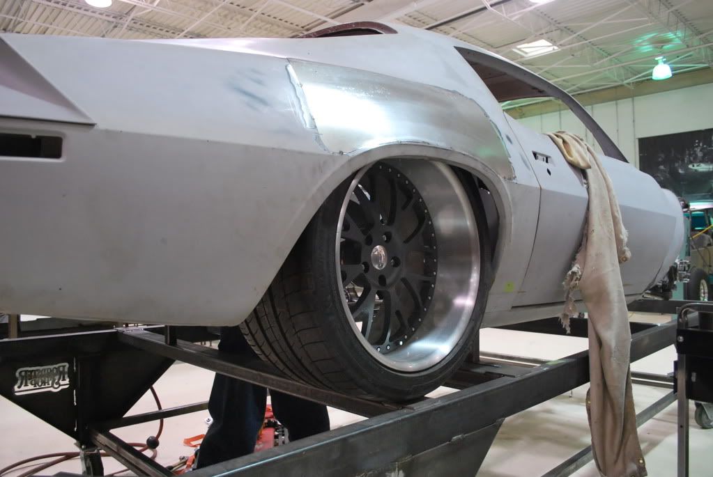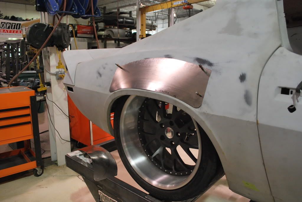 Ride Height mock ups - The goal was to get this car sitting low with larger tires than most are runing on their 2nd gens. We really like the way a 20" x12" wheel with a 28" tire looks under the back of these cars. Front will be either an 18" or 19" x 10" with a 295 tire. We were able to get a ride height of 3.75" at the front of the rocker and 4.5" at the rear of the rocker. This thing just looks bad a$$ sitting there!