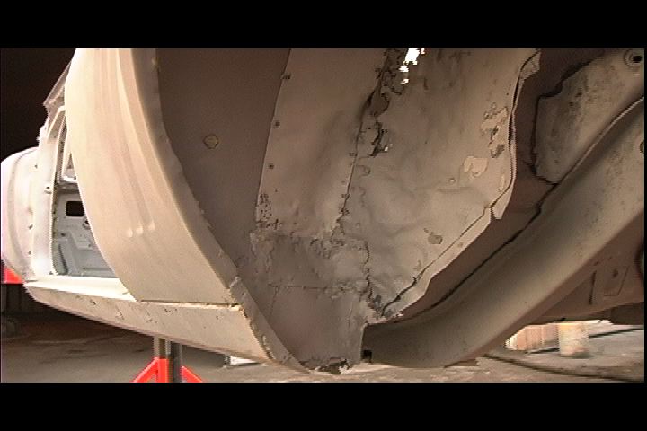 We had the Royal Sport '69 Camaro stripped by Imperial Blasting Technologies... Wally's crew did a fantastic job. We were worried that nothing would come back, as the car's pretty rusty on the bottom. Luckily, our fears were unfounded and we got a whole car back! The media blast job came out really nice, but it revealed some new secrets and made the obvious even more obvious. It's pretty amazing what kind of "innovations" people come up with when they're hacking a body together with pop rivets and body filler! We do have some substantial panel replacement to do, and we're going to cover it all on our show between now and SEMA.