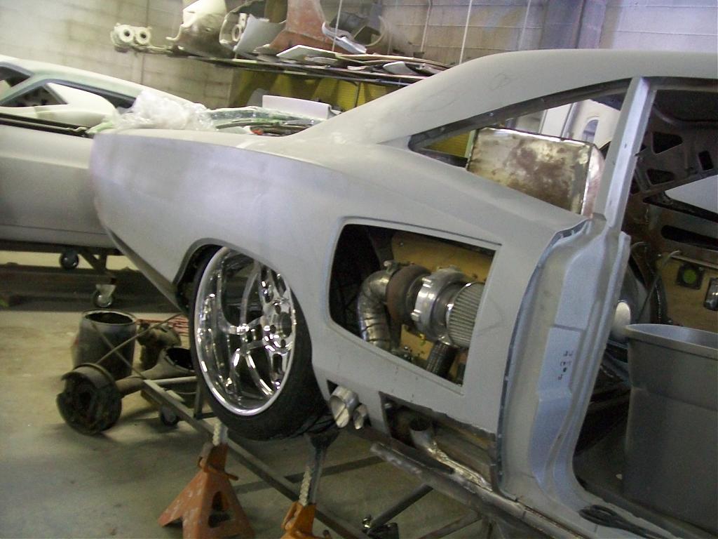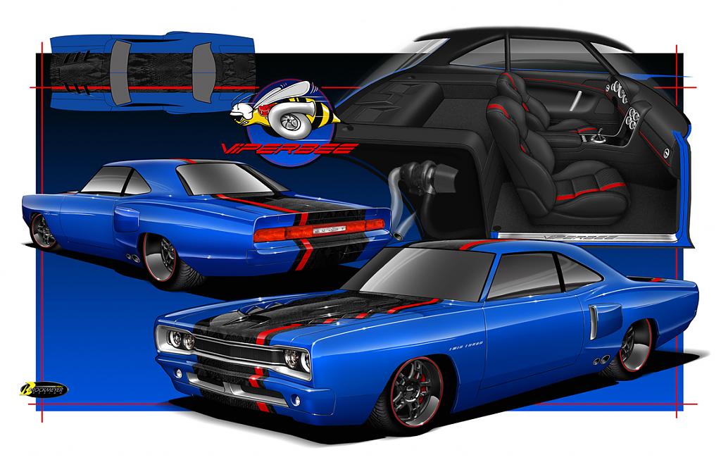 When John brought us this 69 Superbee, and asked us to build him a monster, We smiled, and started cuttin. This car has bulged quarters, bulged fenders, turbos remote mounted in the quarters, fabricated grill, engine compartment, Viper v-10, etc etc etc-- We had Eric Brockmeyer set us up with a rendering, and once it was finalized, the fun began. this build is still in progress, but more photos will come as build proceeds.
