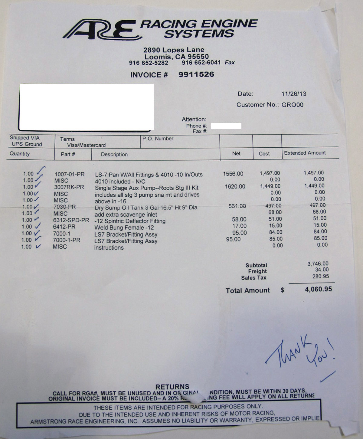 ARE Dry Sump System, including dry sump pan for LS-7 Application. This is from a 69 Camaro Project that was started in 2012, abandoned, restarted, and we have now come to the realization that we just do not have the bandwidth to finish it. Please see photographs for what is exactly included. Sump was never run in a car but was removed, and installed on engine once so it has new motor oil drippings on it. Tank was fit in place but no hoses installed, never filled, other parts pulled from boxes, covered with masking tape to protect it, and accommodations were made to install it into the project car. Most items are still in new condition, some items may have light scratches, be dusty, or have tape residue on them (see photos). Condition is very good but not pristine(See Photos). Some smaller items like hardware may be missing. There are no hoses with this kit.