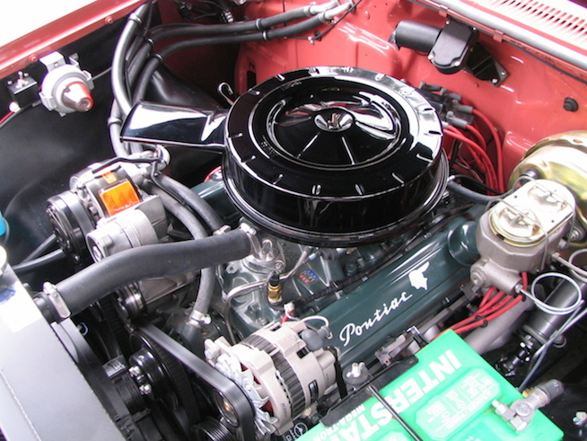 Block: NEW SBC Roller Cam block, dynamic balance to match new rods and crank, Speed Pro Hypereutectic with moly coated skirts, Comp Cams Flat Tappet Camshaft (slight lump at idle), Edelbrock Performer intake with Holley 600 cfm shiny carb, electric fuel pump, MSD HEI Ignition, GM Serpentine frontrunner kit, Engine painted 1957 Pontiac Green.