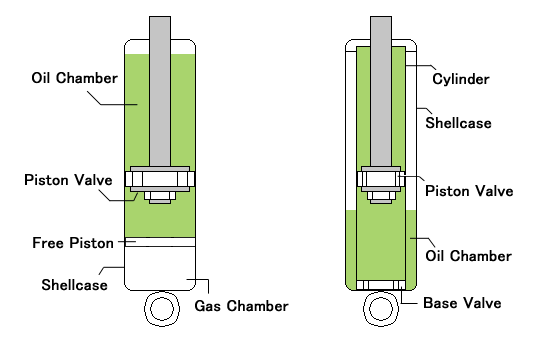 Monotube: As you can see there is only one tube. Said tube contains two media, oil and nitrogen gas. These are separated by a dividing piston which can “float” up and down the tube.