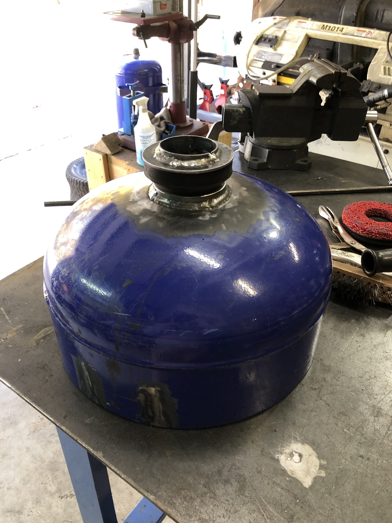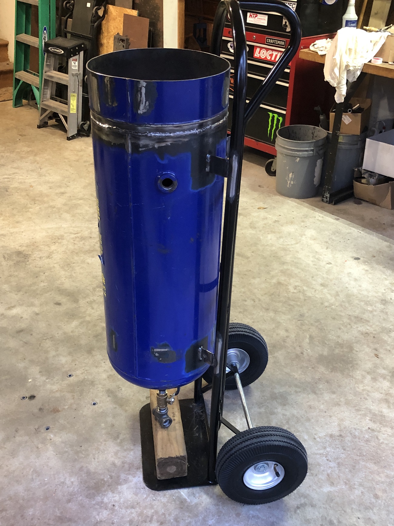Started with a 17 gal. compressor off CL for $40. Cut the top off to invert for the fill valve. Made a pop-up valve from EMT tube, plate steel and a 2" toilet tank rubber seal. Made the seat out of a rear diff bearing race.