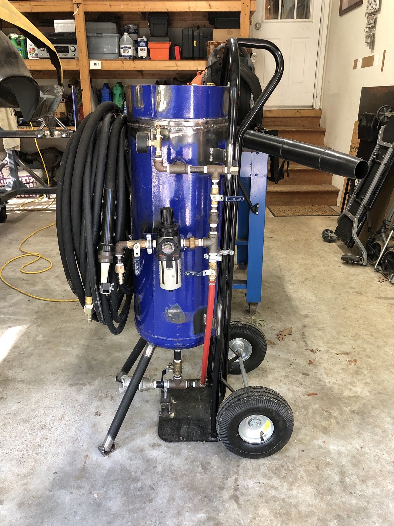 4. The concave bottom of the vessel is not quite enough to keep the media flowing efficiently when it gets down to the last 10# of media. I think I could overcome this issue with a pot vibrating device but that has it's own set of issues. For now, I just have to keep the pot full of media. It holds 100# of silica easily which lasts for 20-30 min. of blasting. I need a break after that long anyways.