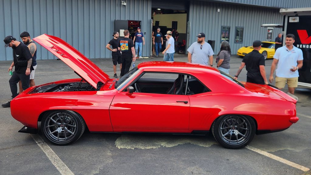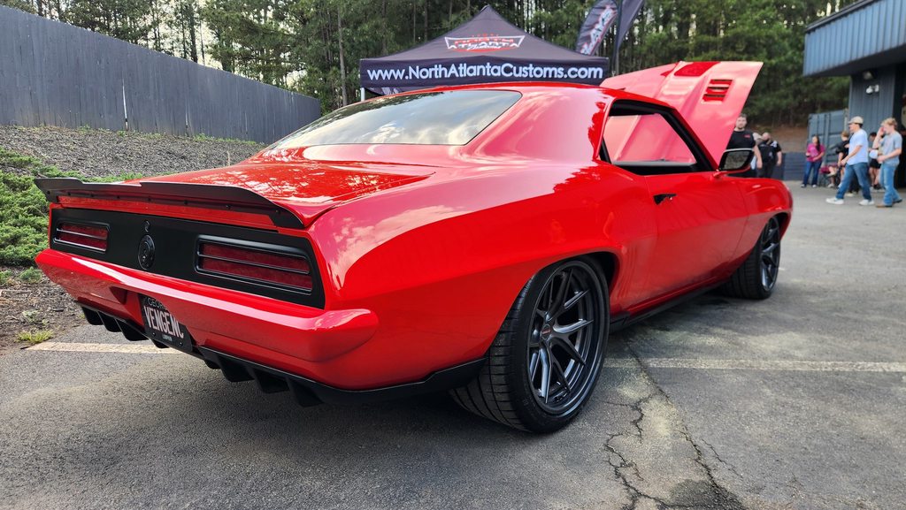 Spicy! Michael Chastain's 1969 Chevrolet Camaro was built by Dutchboys Hotrods and was on display, at the 2026 Vengeance Racing Street Car Takeover Pre-Party. It's powered by a Chevrolet Performance supercharged LT5 mated to a Bowler Performance Transmissions Carbon-Edition 6-speed sequential transmission and rides on Detroit Speed suspension, Baer brakes, 275/30ZR19 & 325/30ZR19 Michelin tires, and 19x10/19x12 Forgeline Carbon+Forged CF201 wheels finished with Transparent Smoke centers and real carbon fiber barrels in Full Gloss. See more at: https://www.forgeline.com/customer-g...astain/cgk2978