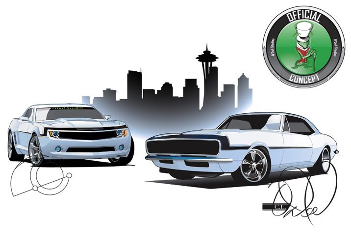 I did the 68, my brother did the 09 and the background. I have yet another brother who lives in the pictured city who used to see a 68 (SS clone I think) like this on his way to work everyday until it was sold. Anyway, we did this for him. Wanted the new one to match the old ... be pretty cool if they use this stripe on the new car imo.