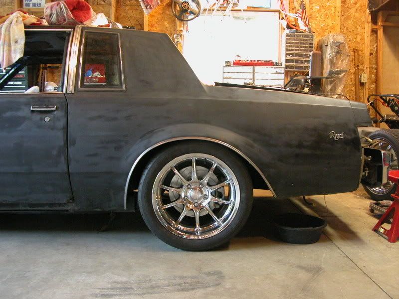 Well, its been a while since the last update. I have completed the rear suspension except the sway bar, WAITING FOR SC&C. The front steering and suspension as almost complete as well. I ordered my Corvette calipers and brackets from Kore 3 and my pads from Hawk. Right now the fromt wheel is just sitting in place, wanted to see how it would look. I spent most of the day today hammering and cutting in the rear wheel tubs to get the 295's to fit, and now they do. I had to cut a little of the wheel well trim to get the tire to tuck, but not enough you would see it clear as day. So, I sould have to car rolling by the end of the weekend and on the road shortly after I hope. Then next winter it gets to come back apart for body work. Here are some pics.