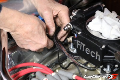 With the old gone, the time came for the new. After sliding the FiTech unit on the studs, we simply tightened down four nuts and the majority of the work was finished. After attaching the throttle linkage, we tackled the fuel system. Since the mounting point was different on this set up compared to the old, we did have to extend the line a bit and use a different fitting in order to make the proper AN fitting connection.