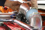 To start installation, we disconnected the battery and removed the hat coming off the turbo. From here the throttle linkage, fuel lines and existing wiring was removed. The last step was to unbolt the old unit and scrape the old gasket off the intake.
