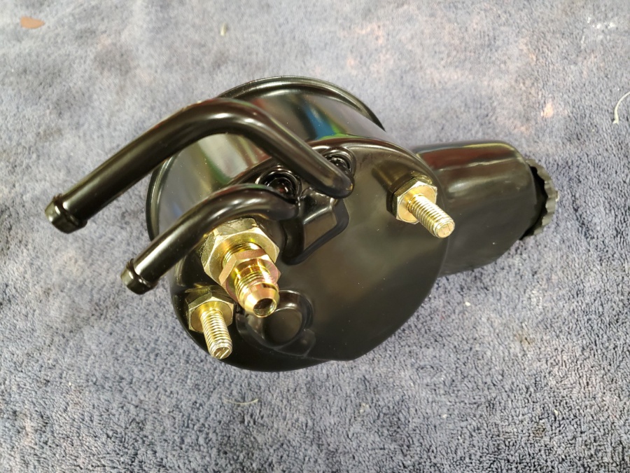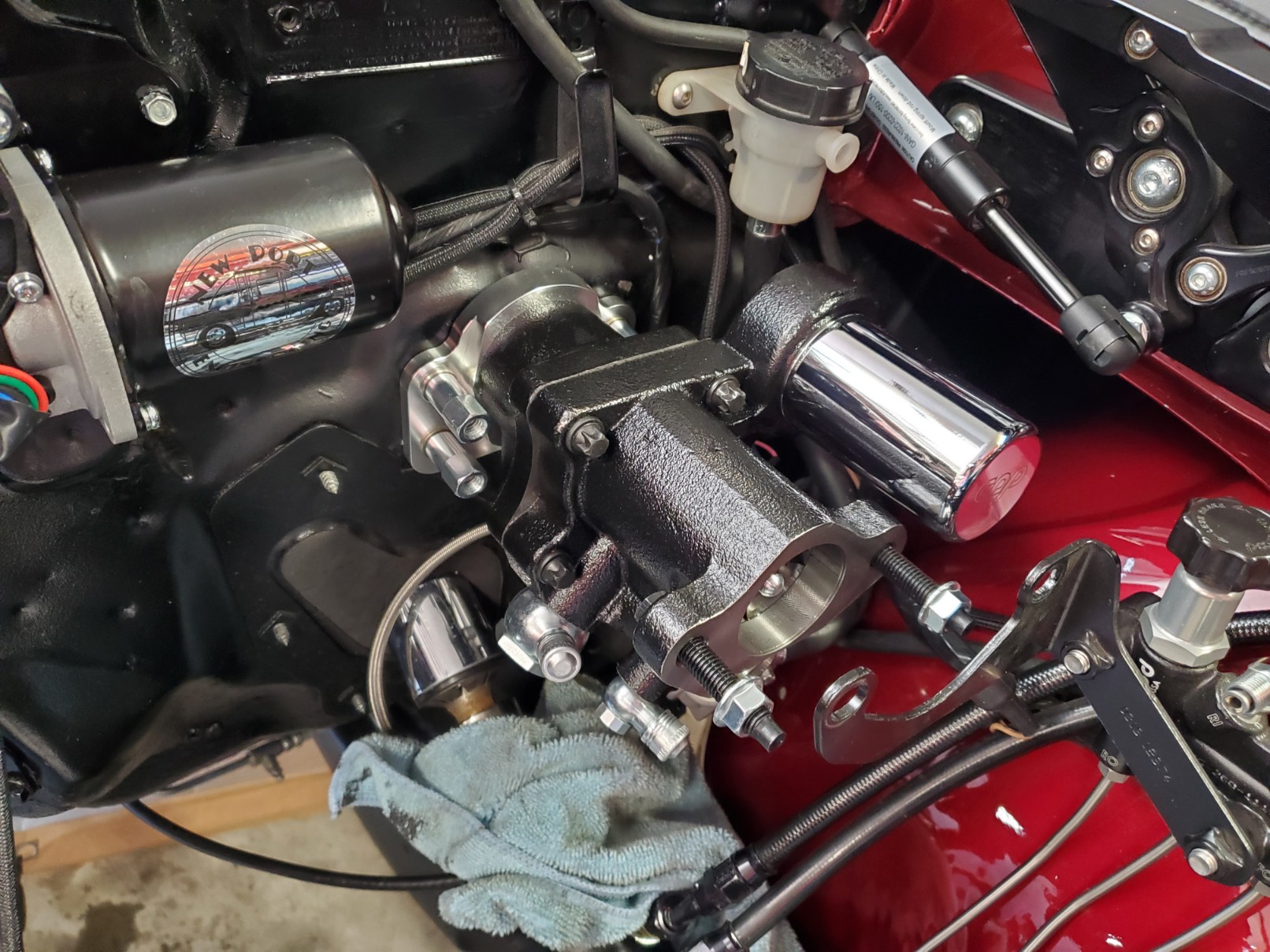After measuring we ended up about .020″ too long, which would pre-load the master cylinder and cause the brakes to drag. The pushrod in the Hydrastop is not adjustable, so I ended up grinding down the bullet-shaped insert on the back side, maintaining the rounded end so it would locate properly in the master cylinder. After a couple tries I had .010″-.015″ clearance at rest and did the final installation of the master to the booster.