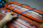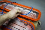 On the valve covers we popped off the SBC covers and adapters out of the way. The new Lokar BBC valve covers are unique in that they bolt directly to the LS heads and they do not need an extra adapter that would add to the height (the Lokar covers are only 2” tall) and could leak. The covers use a factory LS gasket, so we picked up a brand new set from NAPA on our way home the other day. The new gaskets simply push into the valve covers like a factory set of LS valve covers. Before going further we installed the faux outer mounting bolts and load spreaders just like a real BBC valve cover would use.