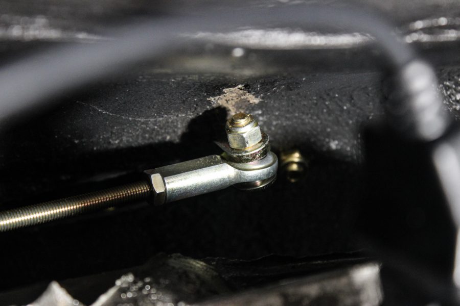 With that measurement we took the long rod of all-thread and cut it to fit. The instructions say to take the distance between the two arms, subtract 1-3/4″ and cut it. After that we threaded on the rod ends and bolted the assembly to the shifter and transmission.