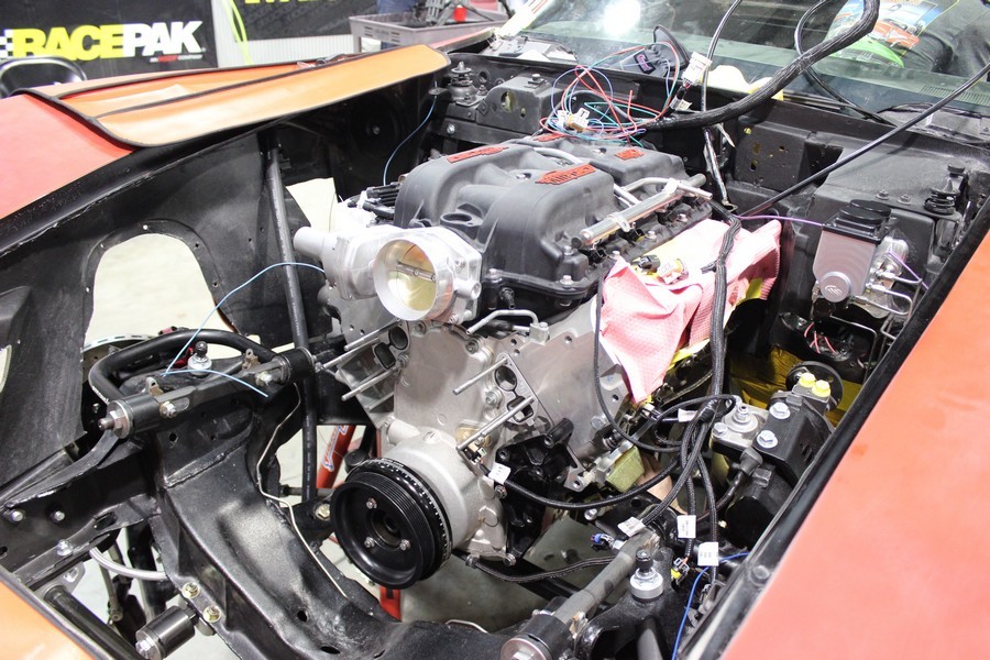 The remainder of the day was spent on tons of the nitty-gritty, time consuming things like all the wiring, plumbing and linkages. Wiring was being handled by the folks from American Auto Wire and Classic Instruments. RacePak also showed up and was beginning to install a full data-logging system. We caught up with them and they let us know that this system will keep tabs on the roll, pitch, lateral-g’s, lap times, shock travel along with engine, oil and rear end temperature. Basically, you’ll end up with live data logging and be able to know exactly what the car is doing on the track, down to what it’s doing in a particular corner, allowing you to tweak the car as needed and monitor progress.