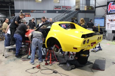 By the end of the day the two guys working on the vinyl wrap had transformed almost all of the red machine into a yellow beast. The LS7 engine and T-56 transmission were cozy in their new home. In front of the motor the Vintage Air front runner system was finished off, including mounting the condenser in front of the ultra-slick C&R Racing radiator. The front suspension was finished and a massive set of Baer brakes was installed. A ton of wiring was also completed, but that aspect wasn’t 100% finished. The Forgeline wheels were wrapped in Falken tires, patiently waiting to be installed on the car. Even some of the cosmetic pieces were installed, such as the rear tail lights, side marker lamps, along with the rear spoiler.