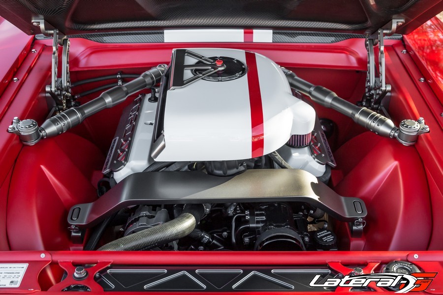 “All of ‘SPLITR’s’ racy looks and massive power would be useless if the car didn’t handle, but that’s not an issue thanks to Detroit Speed Engineering. “SPLITR” uses DSE’s AlumaFrame front suspension system which is comprised of a cast aluminum cradle, custom-tuned steering rack, tubular suspension arms, and custom valved adjustable JRi coilover shocks. The rear is kept in line with Detroit Speed’s QUADRALink suspension system and custom valved JRi coilover shocks. Front and rear sway bars are also from Detroit Speed. Stopping power is provided by Baer with huge 6S Extreme calipers with 14-inch rotors front and rear. ‘SPLITR’ rides on custom forged HRE Wheels wrapped in sticky Nitto Invo tires sized 265/35/18 in the front and 305/30/19 in the rear.