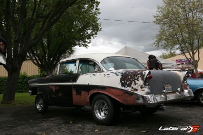 While dodging the rain on my way back to my car, I saw a badass black and grey ’56 Chevy out in the vendor area. I had to stop and check it out! It was slammed down with (brand) wheels, Baer brakes, and an Art Morrison Engineering chassis. Under the hood, the car was just as spectacular with a well-dressed LS topped with an awesome sheetmetal intake. Chris Holstrom and Mark of Chris Holstrom Concepts came down from Puyallup, Wa. to attend their first Pleasanton Goodguys event as a vendor. They were pleasantly surprised at the turnout and the amount of interest at their booth. It was nice to get out of the rain and to talk cars with two great gearheads.