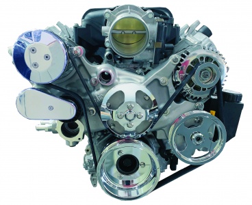 The Vintage Air Cast Front Runner systems for GM LT1 and LS engines are available in power steering or non-power steering configurations and several finish options: polished accessories with chrome pulleys, chrome accessories and pulleys, natural-finish accessories with black hard coat pulleys, or chrome accessories with black hard coat pulleys.